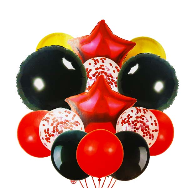 14 globos incluidos: Mezcla de globos en tonos rojo, negro y dorado, con acabados metalizados y de látex.