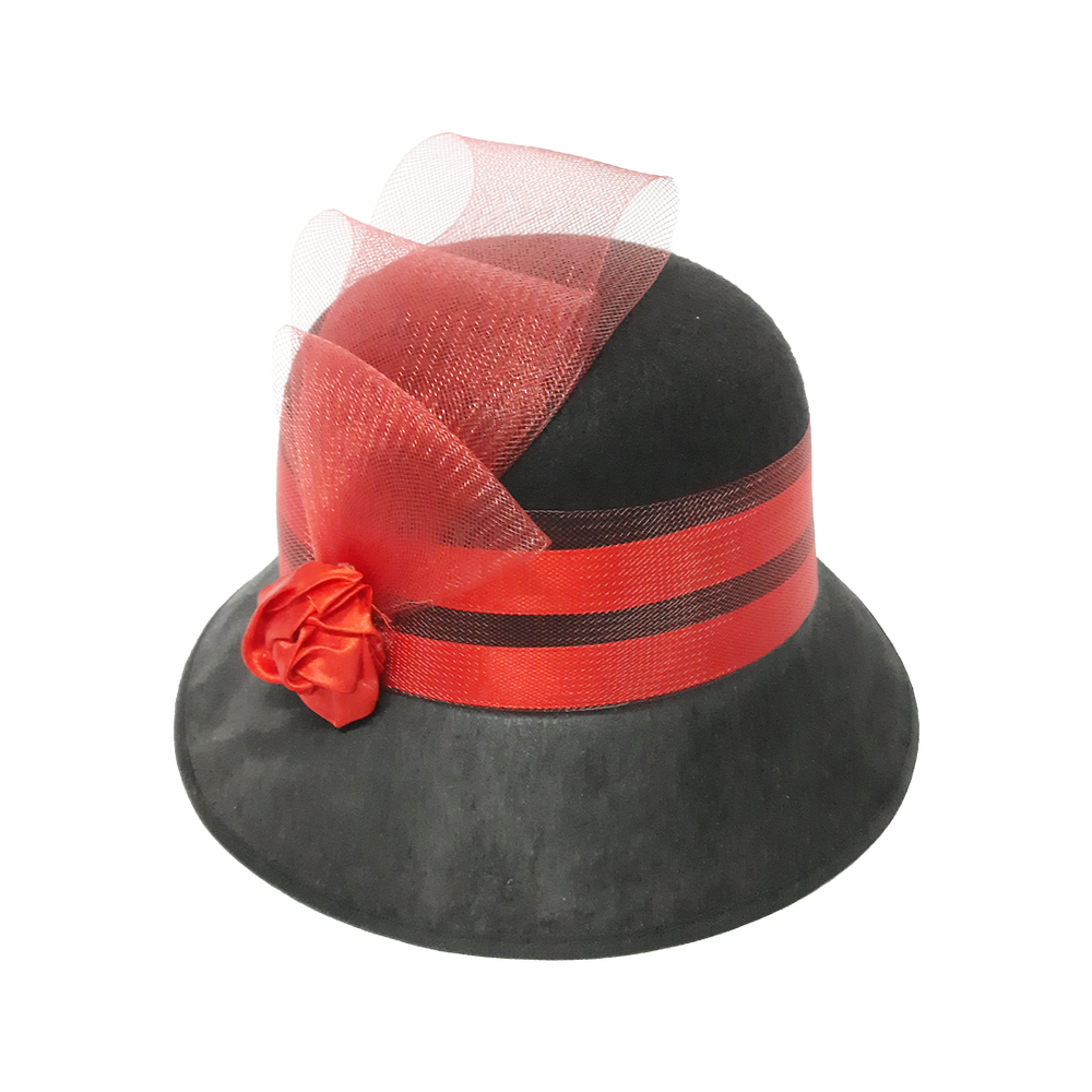 Sombrero negro de dama con cinta, rosa y moño.