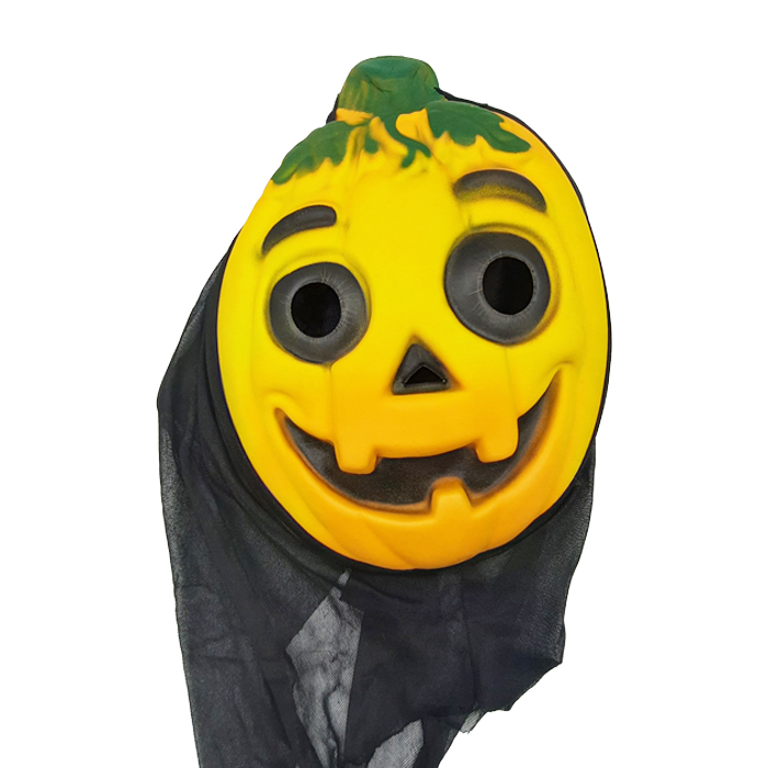 Máscara que cubre toda la cabeza de goma con diseño frontal de calabaza y tela negra en parte trasera.