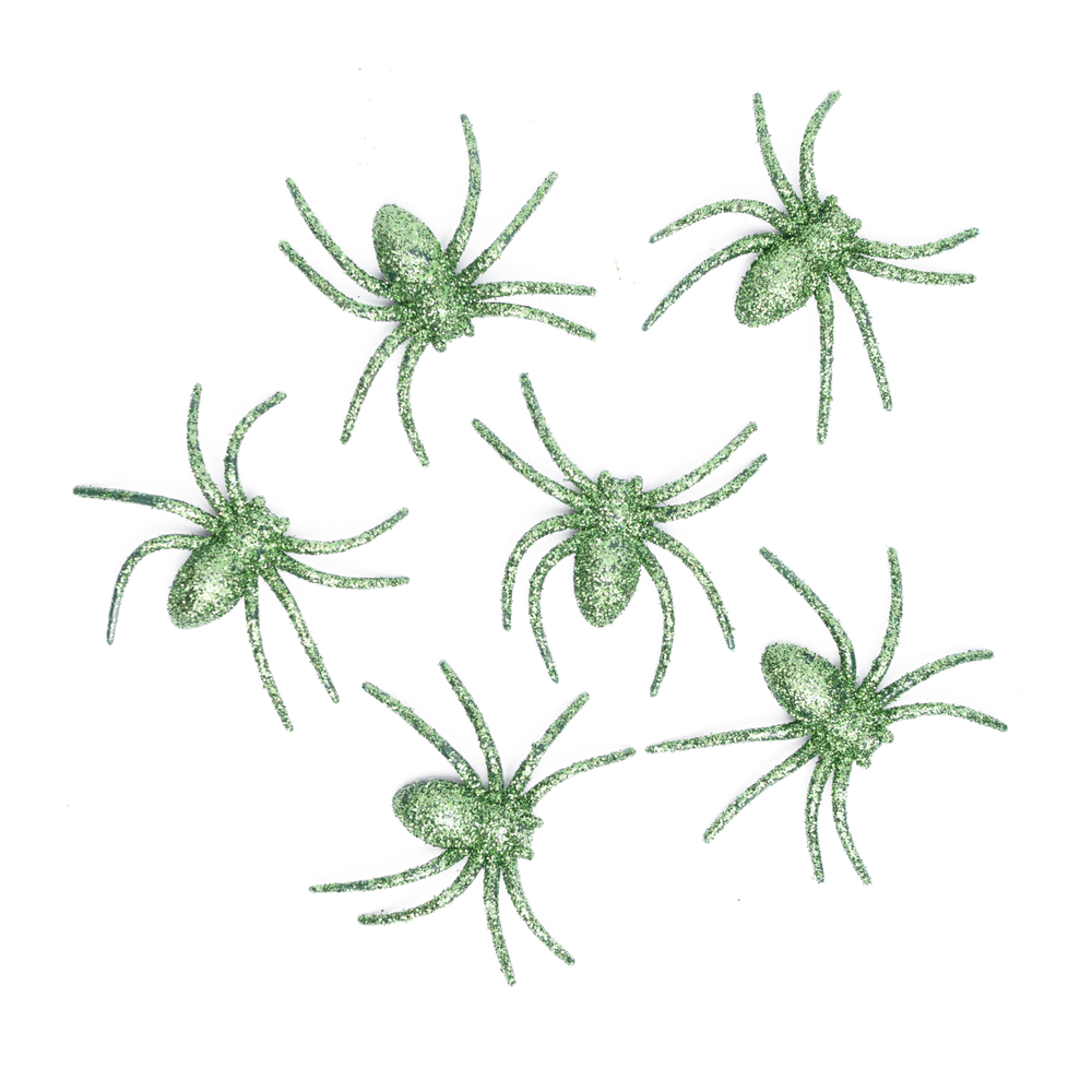 Set de arañas plásticas con glitter en todo su cuerpo.