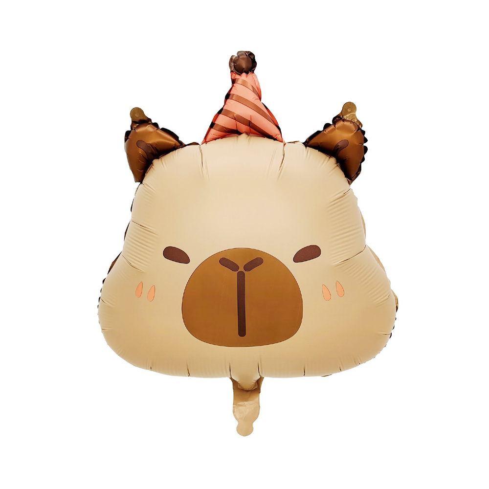 Es un globo metalizado (foil) de 55 cm con la forma de un carpincho (o capibara) decorado especialmente para cumpleaños. Está fabricado en material resistente y reutilizable, con colores vibrantes y detalles que enamoran. Su tamaño es ideal para usar como centro de mesa, parte de un bouquet de globos o para regalar como sorpresa.