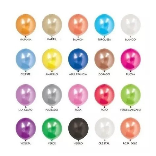 Paquete de globos multicolor. Colores que puede incluir el paquete (no aseguramos que incluyan todos, ni que cada color tenga una cierta cantidad): verde, azul, blanco, turquesa, amarillo, fucsia, naranja, rosado, lila, verde manzana)