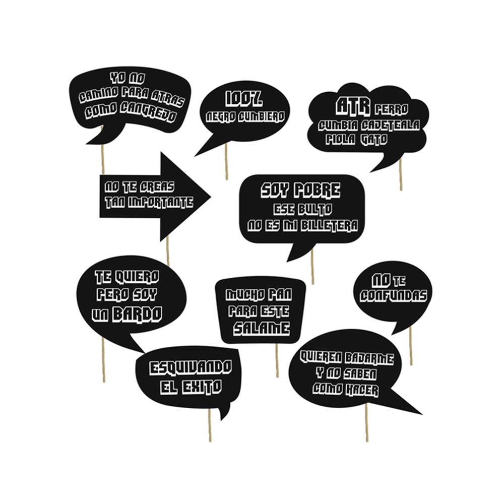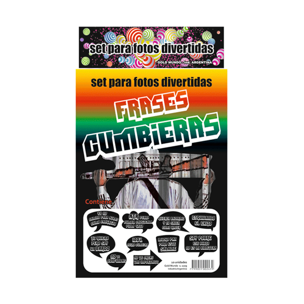 Pack de 13 unidades de palitos con frases divertidas y diseños coloridos sobre frases cumbieras.