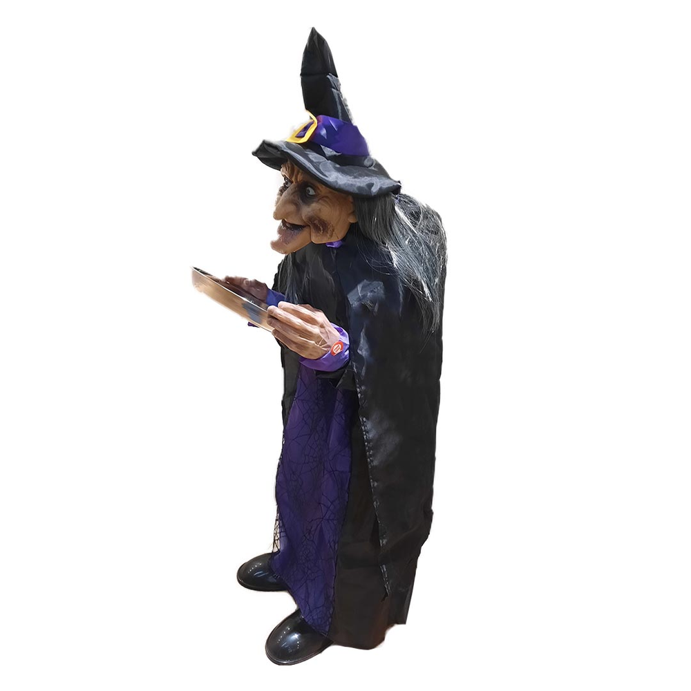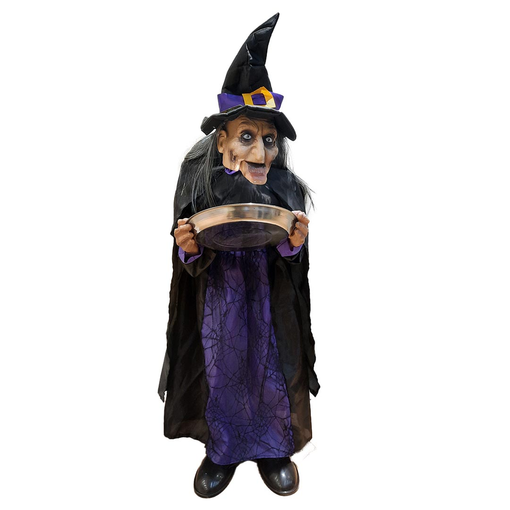 Esta Bruja de 1 metro con LED, sonido y bandeja golosinera es el accesorio perfecto para darle un toque espeluznante y divertido a tu fiesta de Halloween. Coloca caramelos o dulces en la bandeja que sostiene esta figura aterradora mientras asusta a tus invitados con sus ojos de luz LED roja y sonidos de gritos espeluznantes.