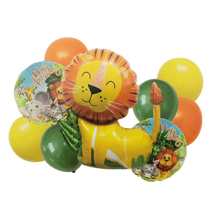 Incluye 9 globos con temática safari: 2 GLOBOS DE LÁTEX VERDES DE 12″, 2 GLOBOS DE LÁTEX AMARILLOS DE 12″, 2 GLOBOS DE LÁTEX NARANJADOS DE 12″ 2 GLOBOS METALIZADOS REDONDOS DE 18″ DE SAFARI, 1 GLOBO METALIZADO DE LEÓN 67X78 CM.